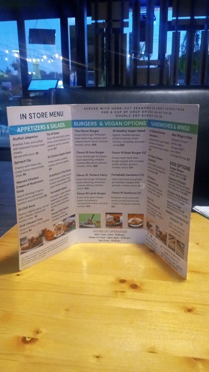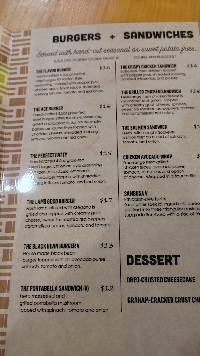 Handcrafted 4.5 ounce grass fed beef burger, Ethiopian style seasoning, topped with pepper jack cheese, spicy flavor sauce, shredded iceberg lettuce, tomato and red onion.