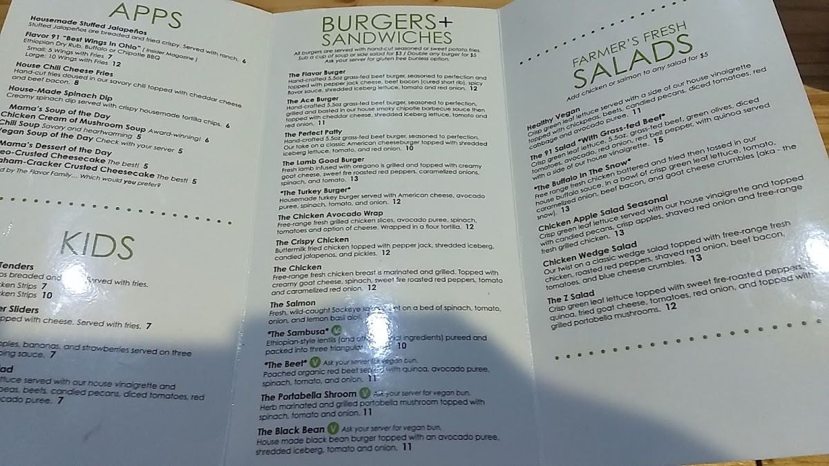 10 wings to an order with flavors: Ethiopian Dry Rub, Buffalo, Chipotle BBQ or Plain Marinade. Fries come with the order.